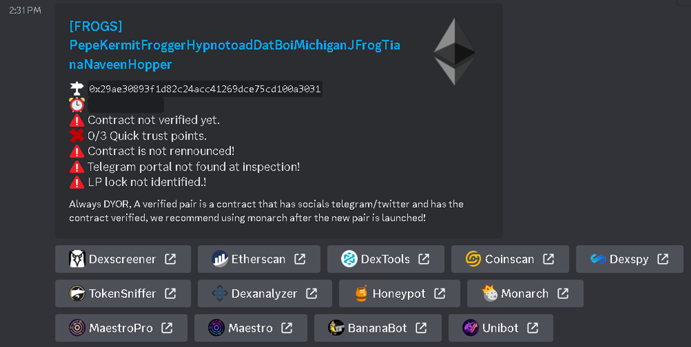 This channel pulls contracts that have not been verified meaning the contract is not visible. When a contract is verified, we detect it and scrape it for more data. Quick buttons are generated to further your research in every filter.